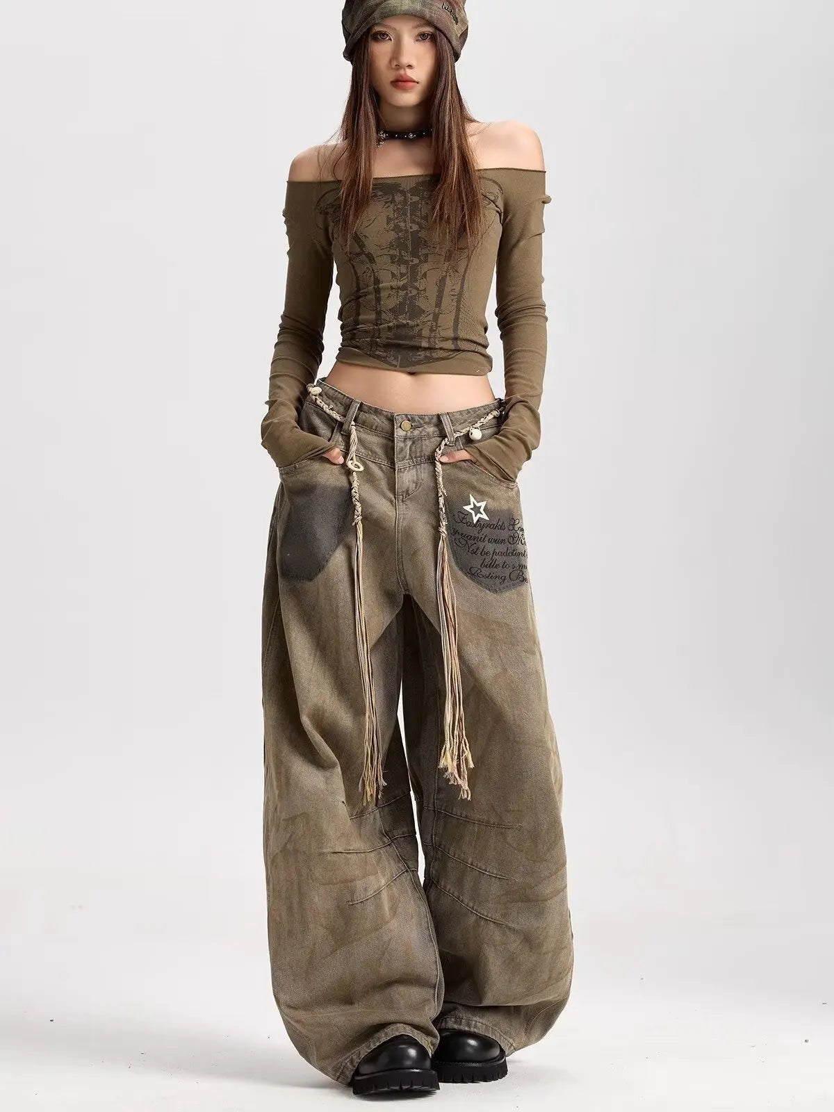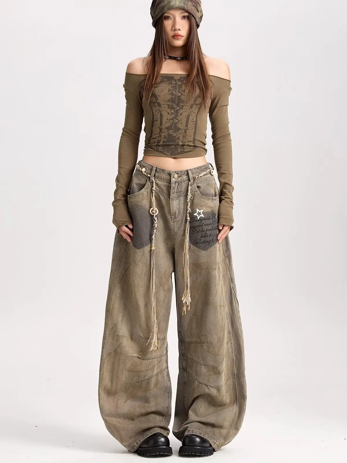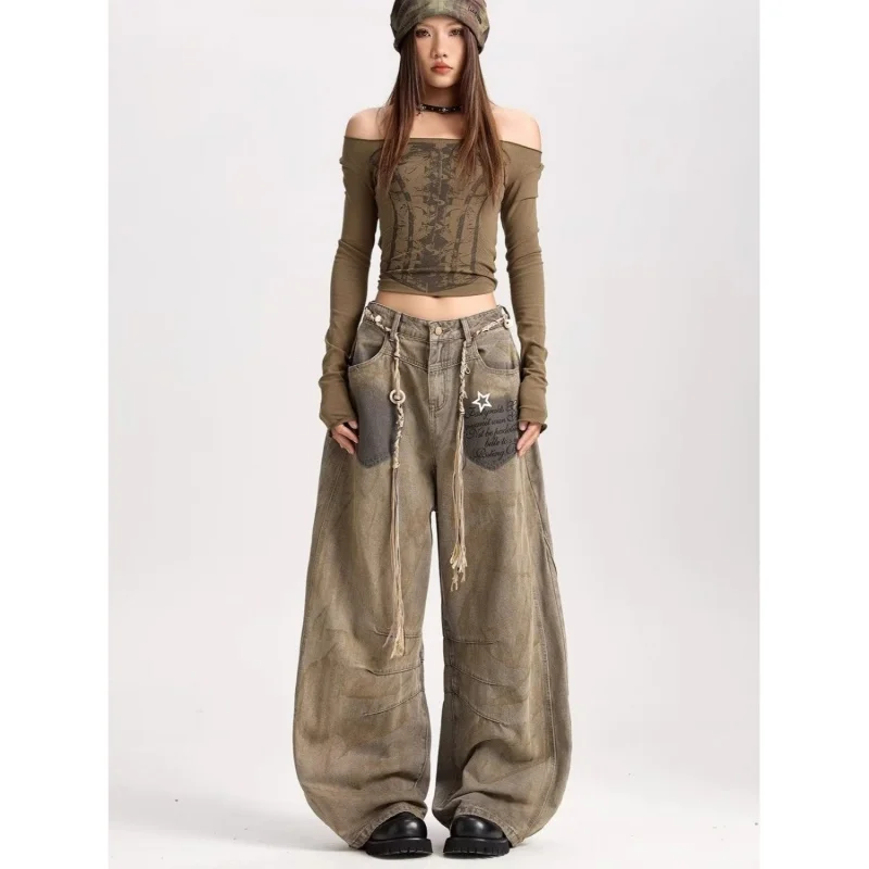 American retro new versatile silhouette curved jeans suitable for both men and women Y2k trendy Harajuku wide leg loose pants