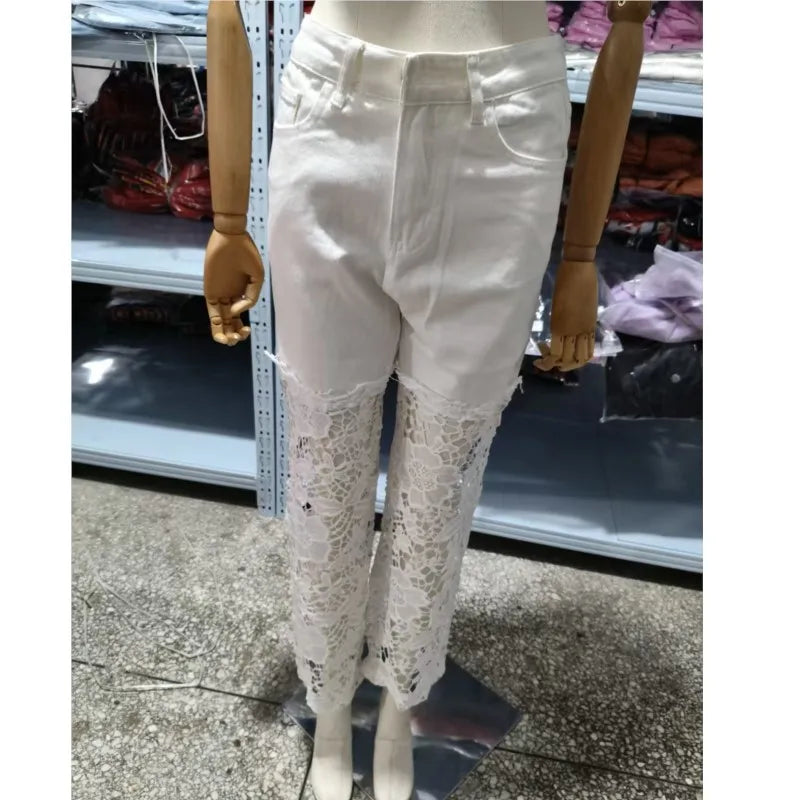Fashion Elegant Jeans for Women High Waist Lace Patchwork Pantalones Hollow Out Oversized Spring Casual Loose All Match Pants