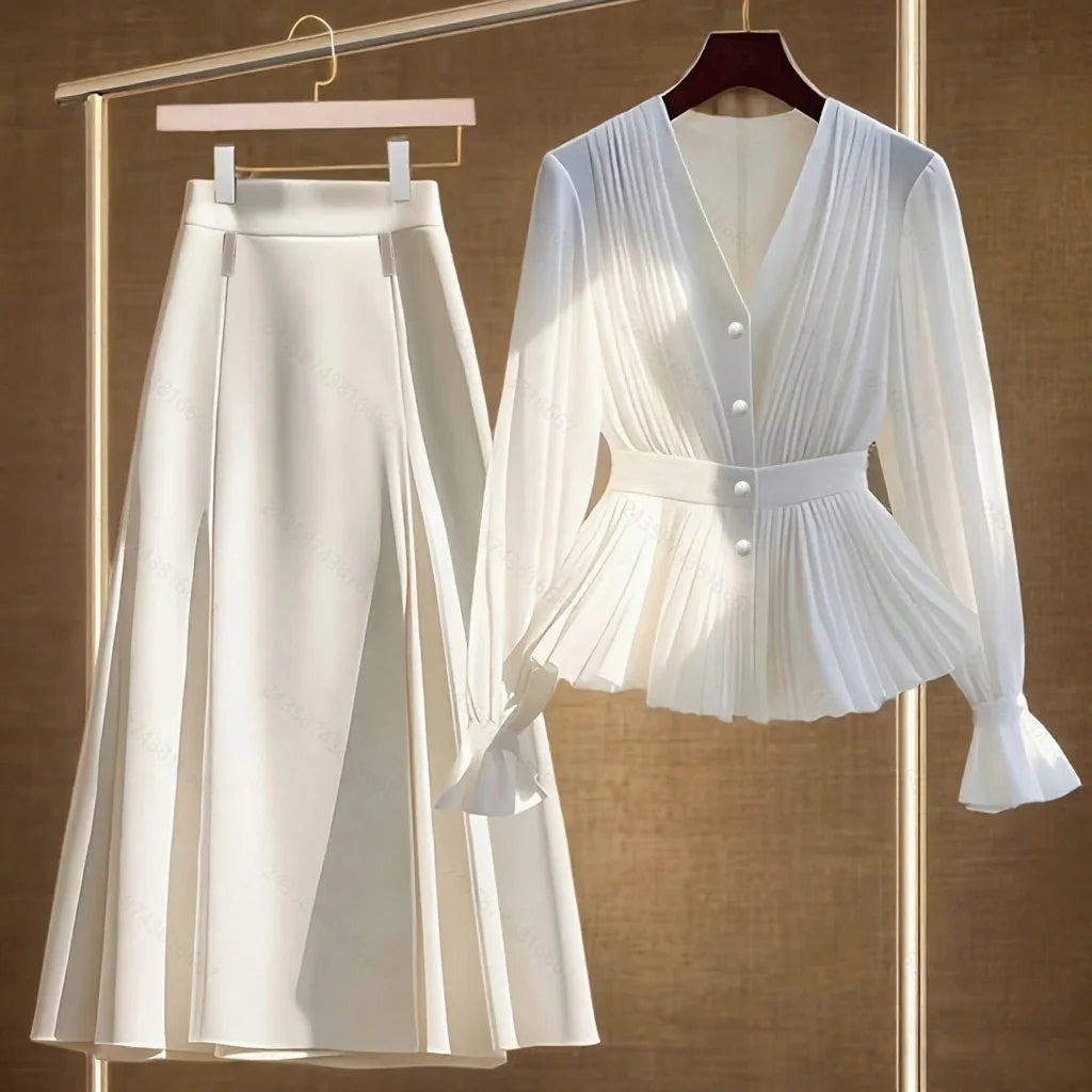 Fashionable Women's French Noble Light Luxury Early Autumn Shirt Skirt Set Waist-Cinched Elegant Two-Piece Ensemble