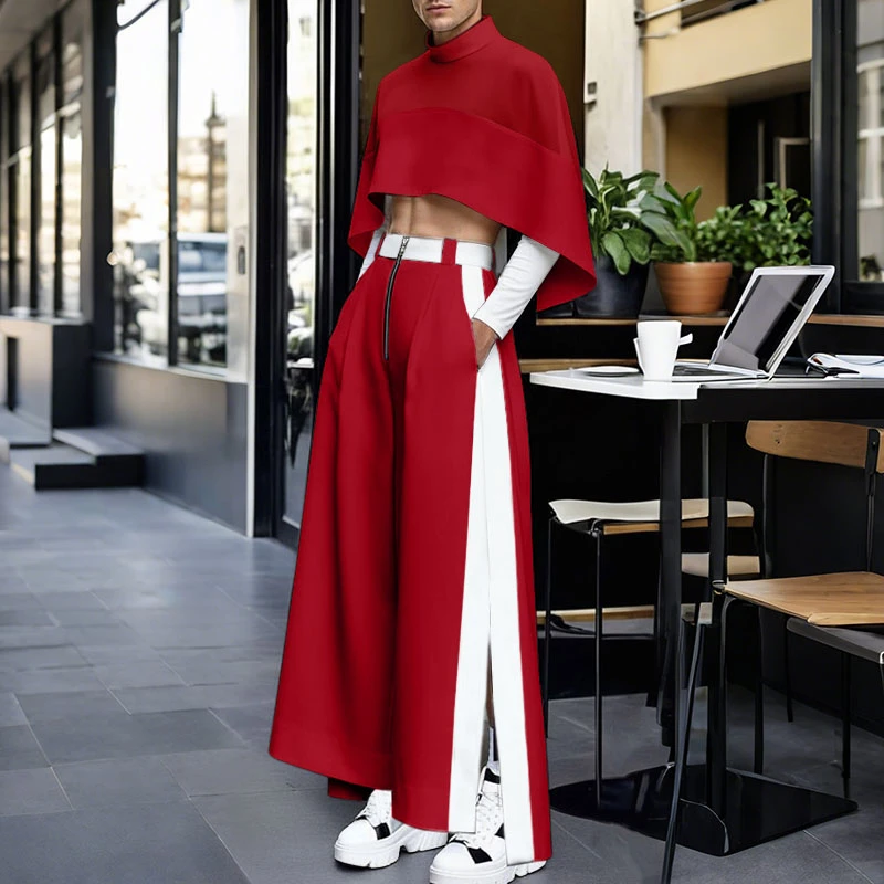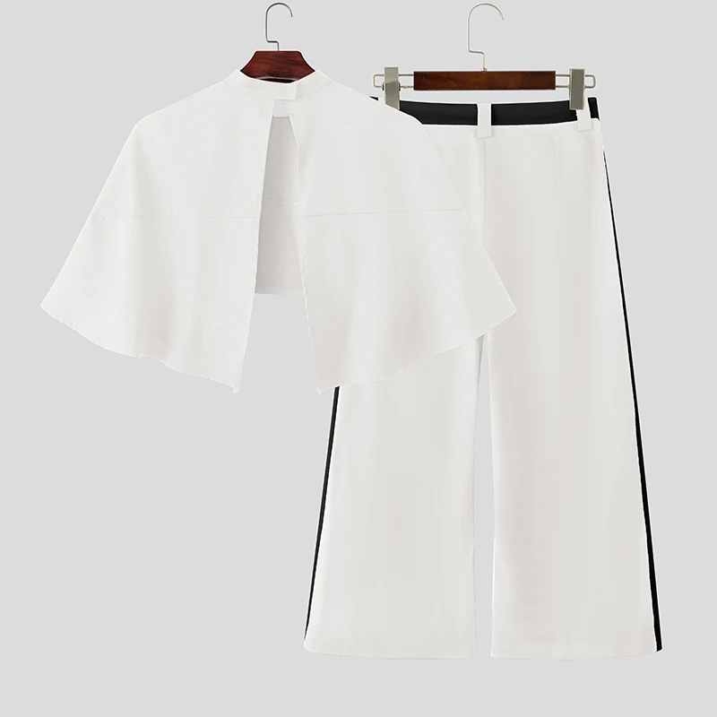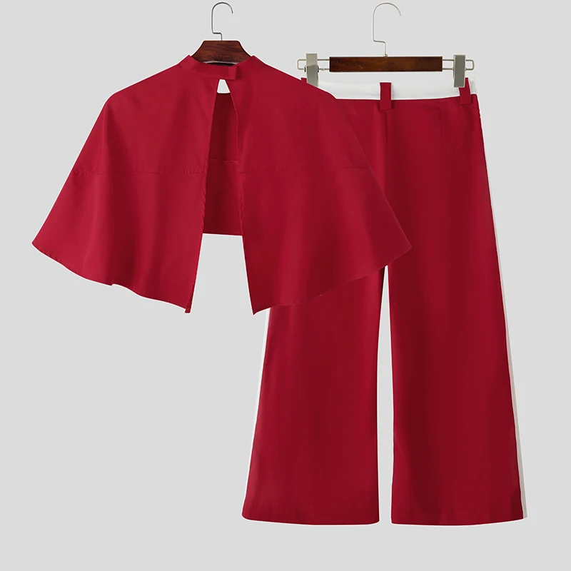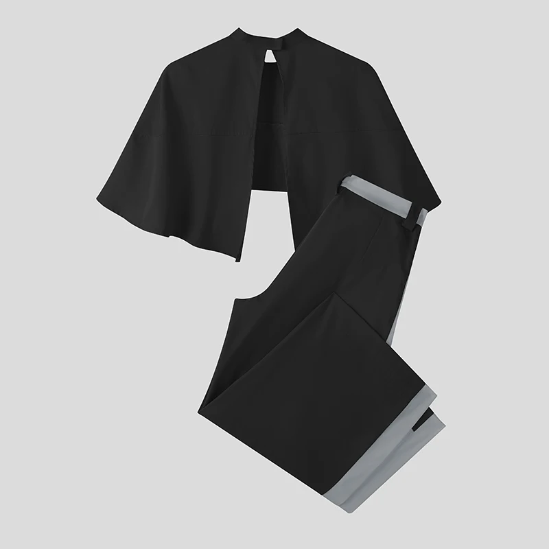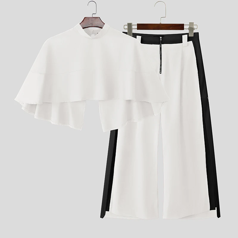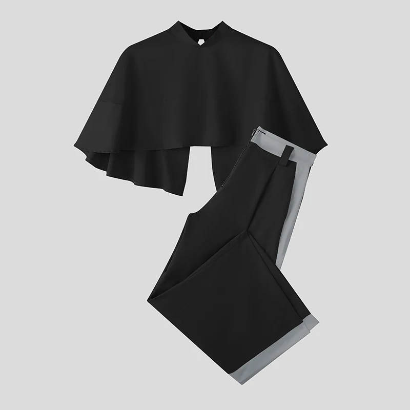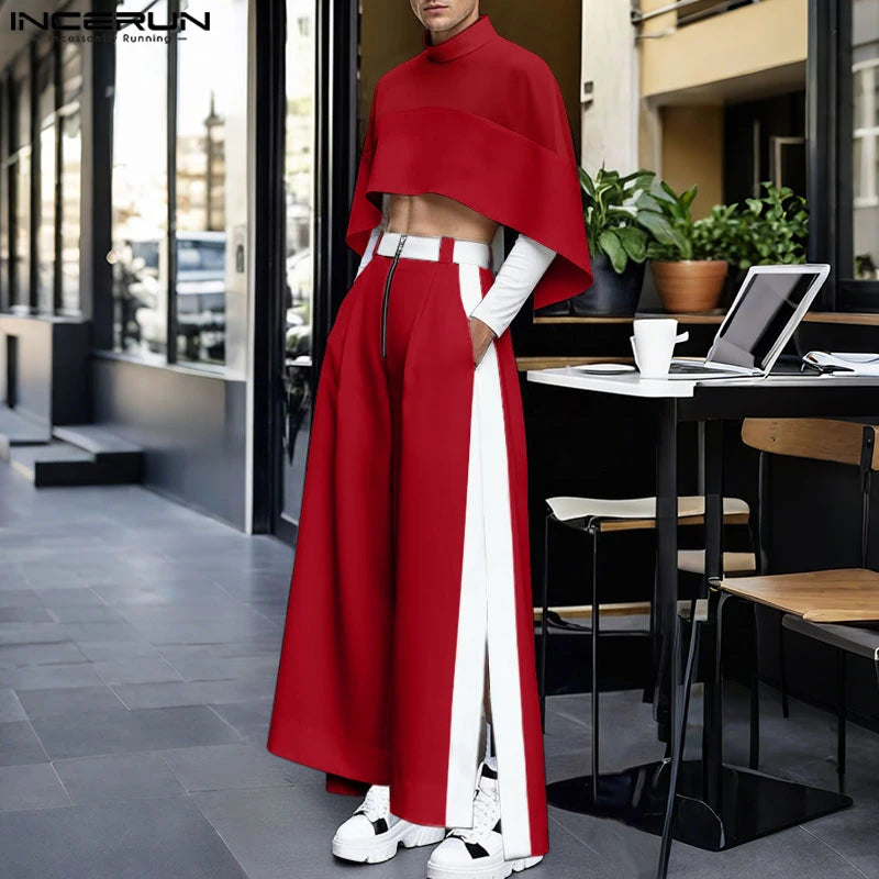 INCERUN Men Sets Patchwork Turtleneck Irregular Crop Shirt Cloak & Wide Leg Pants 2PCS Streetwear Loose Fashion Casual Men Suits
