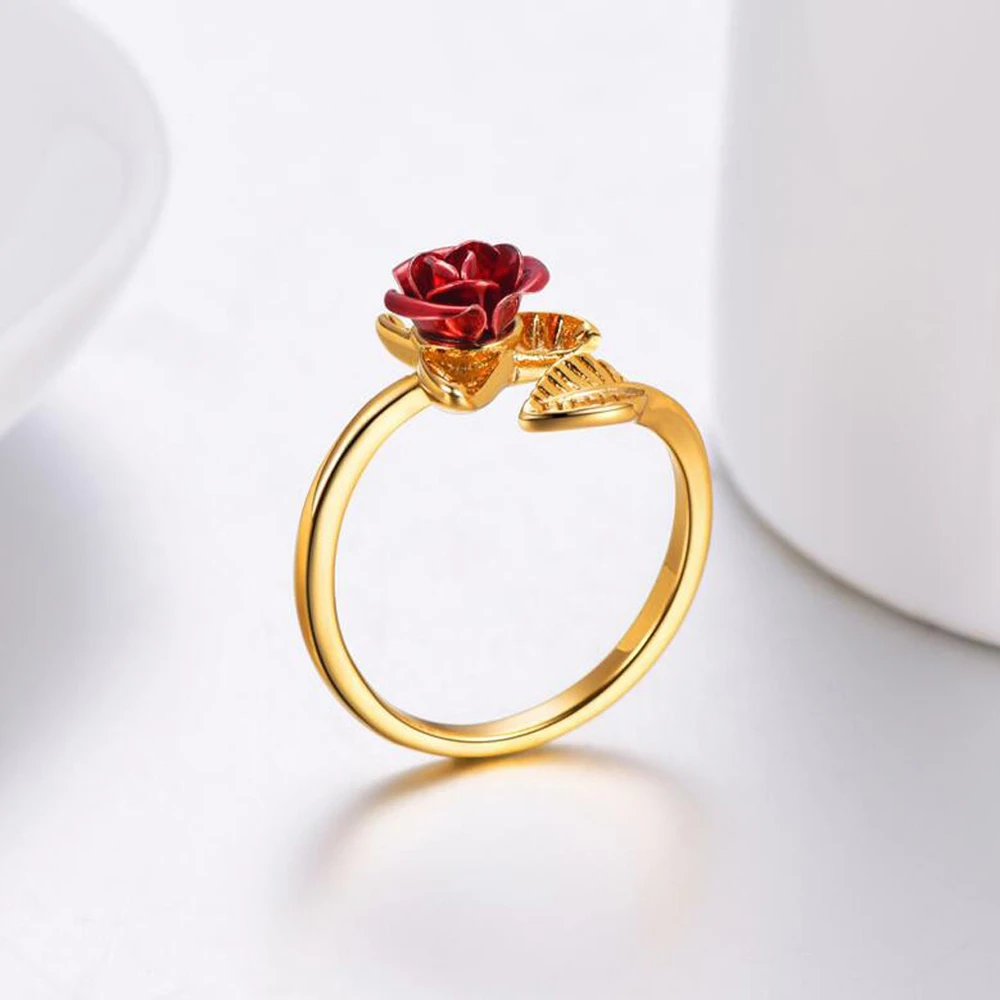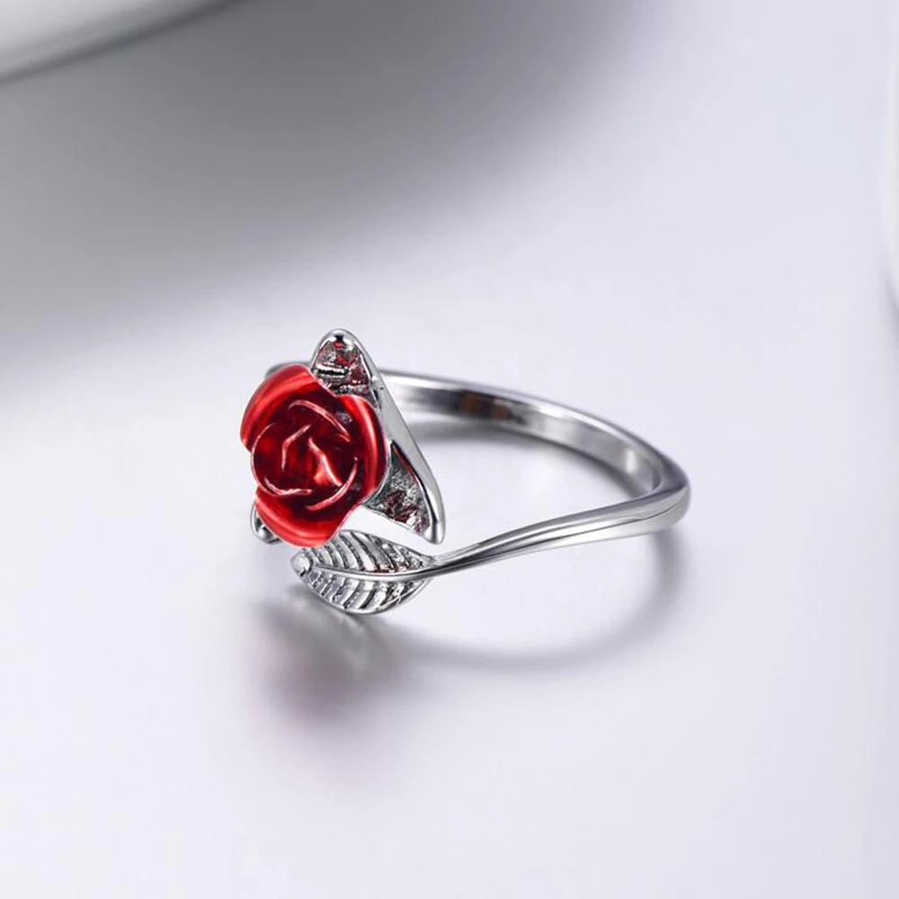 Red Rose Flower Leaves Opening Ring For Women Rhinestone Flowers Adjustable Finger Ring Valentine's Day Engagement Jewelry Gift