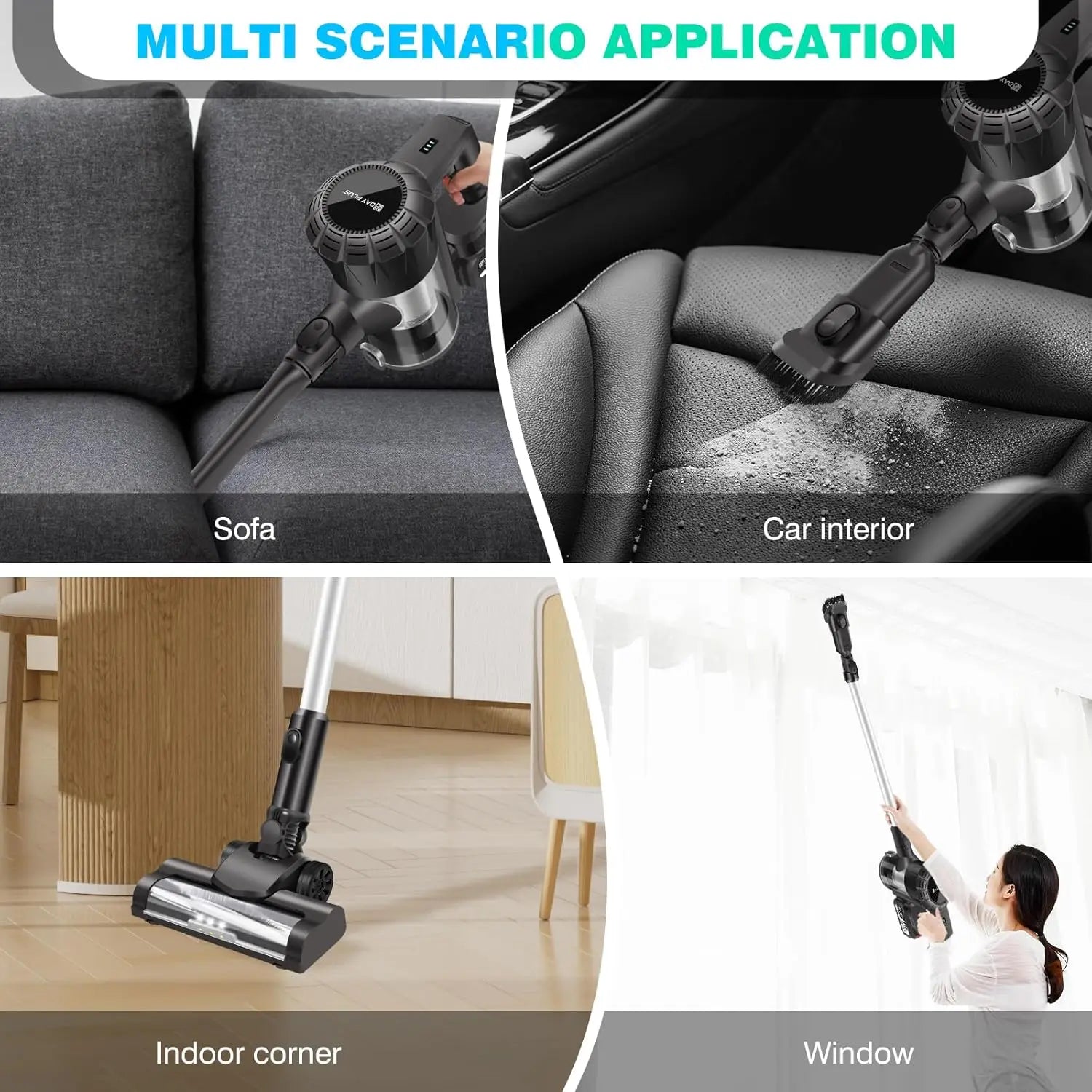 【Wide Range of Use Scenarios】Wireless large suction power vacuum cleaner whole-house cleaning with one machine for all flooring types, used to clean dust and hair on floors, carpets, sofas, cars, curtains, air conditioners, beds, etc., and even kitty litter is easy to get rid of, one machine is equal to six machines to use, satisfy all your cleaning needs at once!