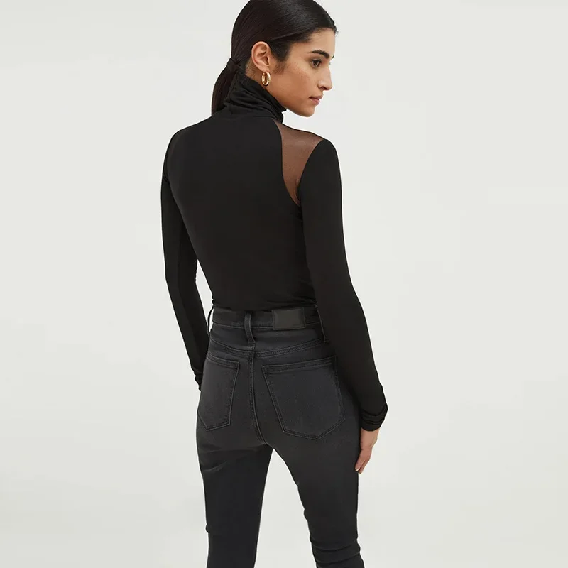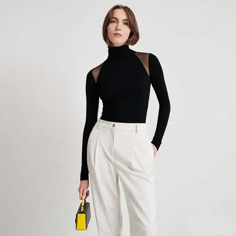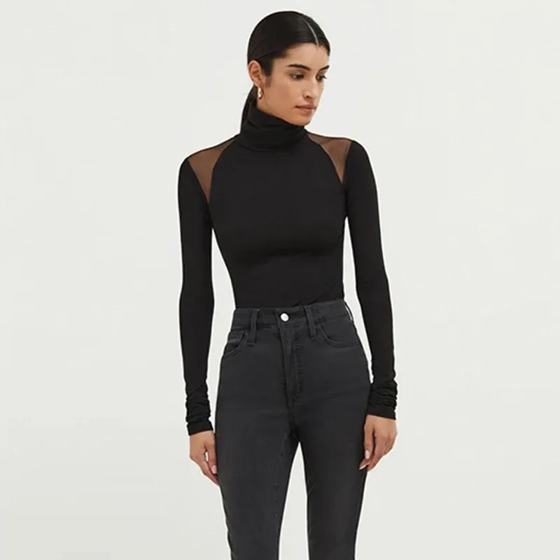 Sexy Slim Fit Long Sleeve Ladies T-shirt Autumn Fashion Black Mesh Patchwork Turtleneck Top Y2k Solid Women's Undershirt