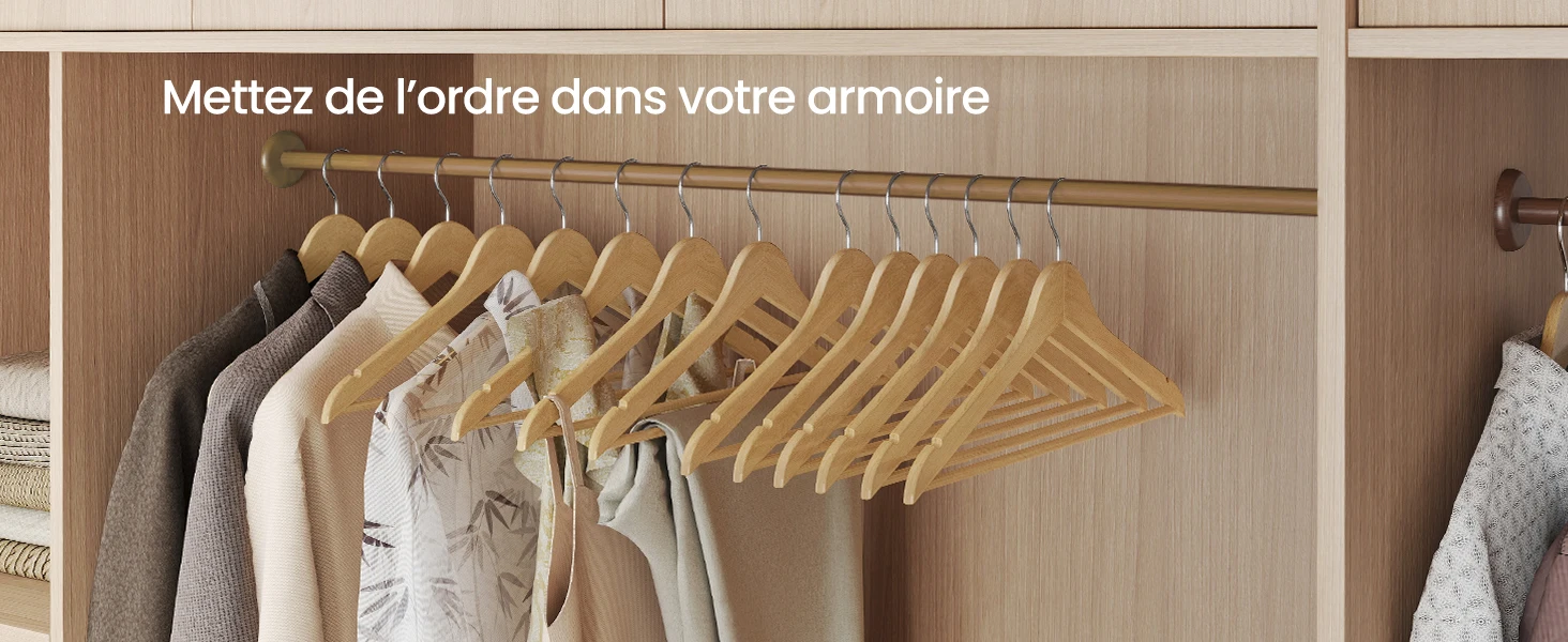 【GAIN DE PLACE】Comparés à d'autres cintres encombrants (1,2 cm), ces cintres en bois fins (seulement 0,8 cm d’épaisseur) vous font gagner environ 30% d'espace dans votre armoire